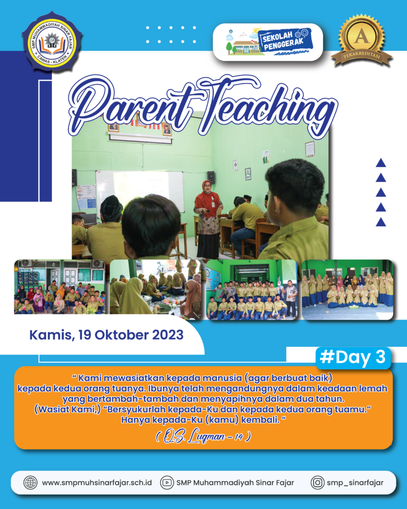Parent TeachingHari KetigaSMP Muhammadiyah Sinar Fajar Cawas, 19 Oktober 2023 SMP Muhammadiyah menyelenggarakan kegiatan parent teaching hari ketiga pada Semester 1 Tahun Pelajaran 2023/2024. Untuk